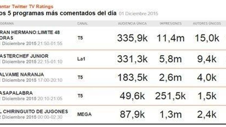 La segunda posición fue para el estreno de la tercera edición de 'MasterChef Junior', que irrumpió con fuerza en la red al cosechar 36.300 comentarios. A más de 20.000 de distancia se quedó 'Sálvame Naranja', tercero con 14.500 tuits.