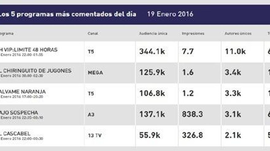 Fuera del podio se quedó el segundo episodio de 'Bajo sospecha', cuarto en el ranking con 6.400 tuits. Por último, 'El Cascabel' de 13tv se coló en el quinto puesto gracias a los 5.700 comentarios que generó la entrevista con el socialista José Luis Corcuera.