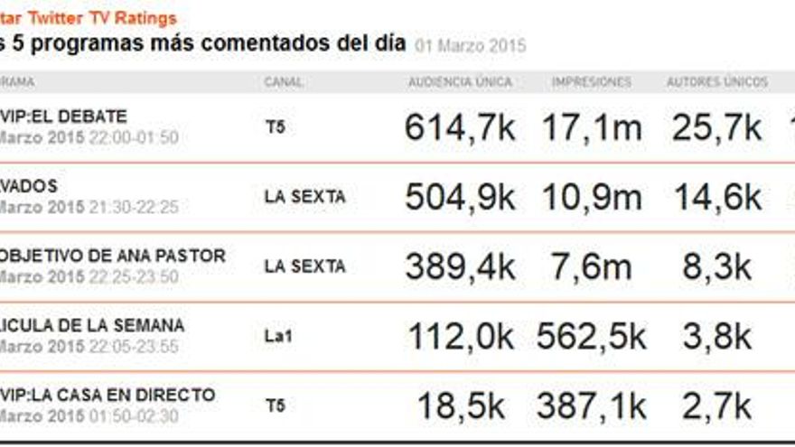 Pese a la gran fortaleza de la noche de laSexta con 'Salvados' y 'El Objetivo', que reúnen más de 45.000 y 20.000 comentarios respectivamente, 'GH VIP: El debate' vuelve a mostrarse intratable con más de 166.000 comentarios, liderando la audiencia social del domingo.