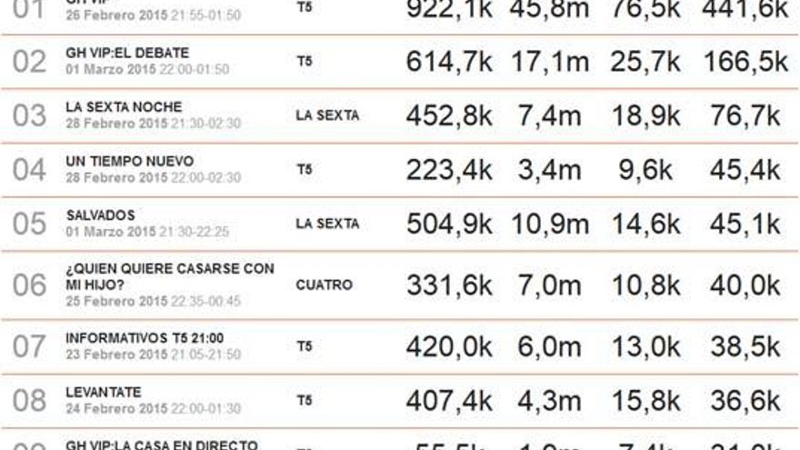 'LaSexta Noche' es tercero, por delante de su rival en la noche de los sábados 'Un tiempo nuevo', que ocupa la cuarta plaza. 'Salvados' supera a los tróspidos, y las últimas cuatro plazas están ocupadas por programas de Telecinco, que se alza con 7 de los 10 puestos de este ránking.