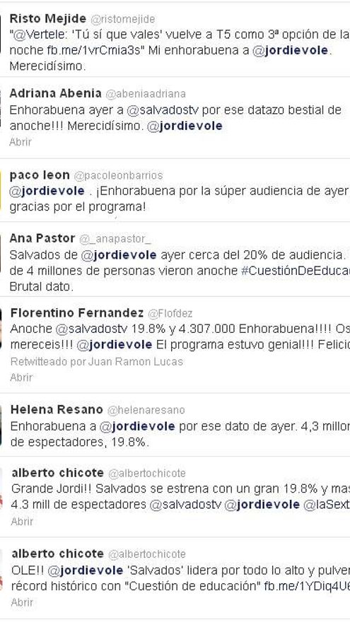 Conocidos los datos de audiencia, las felicitaciones han llegado sin parar a las cuentas de Twitter de Jordi Évole y del programa, Salvados. Muchas de ellas han sido de reconocidos rostros de la pequeña pantalla, entre ellas la de Risto Mejide, “rival” de Évole en la noche del domingo con Tú sí que vales, que reconoce su victoria como “merecidísima” y le felicita.