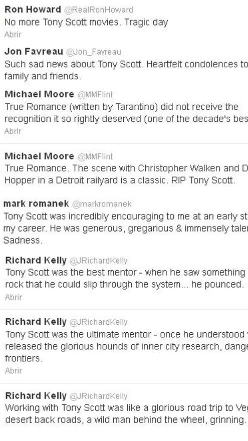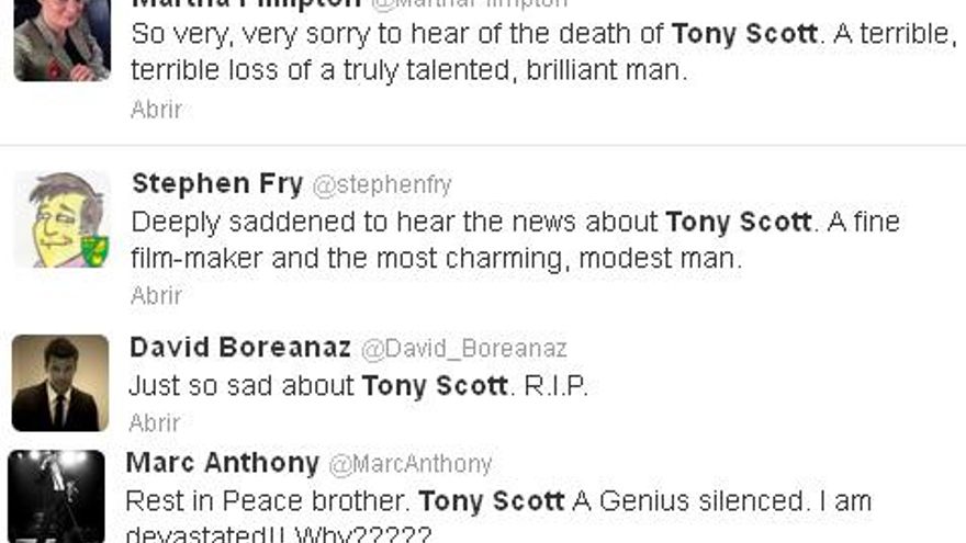 “No más películas de Tony Scott. Día trágico”, declaraba Howard. “Mi pésame de corazón a su familia y amigos”, tuiteaba Jon Favreau ante la “triste noticia” del fallecimiento del director.