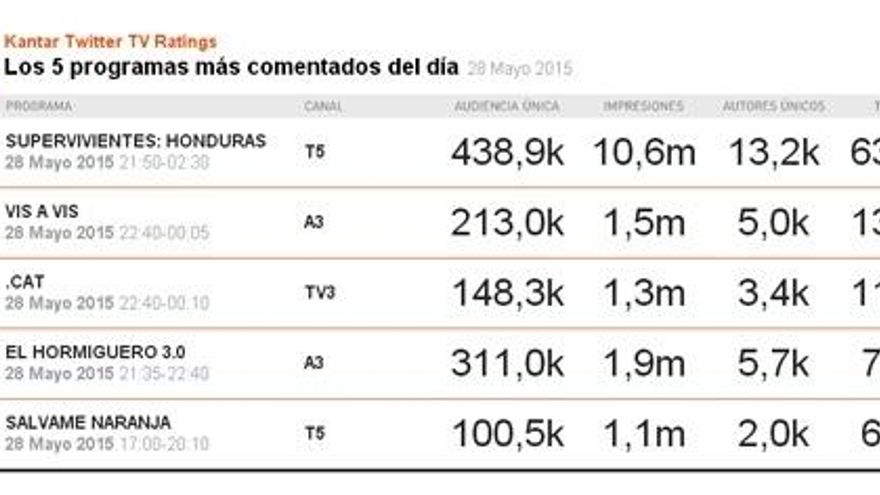 La séptima gala de 'Supervivientes' que incluyó la visita del novio de Isa Pantoja, la expulsión de Lomana y el destierro de Lucía, consiguió 10.6 millones de impresiones en las redes sociales y casi 64.000 tuits convirtiéndose en lo más comentado de la noche. El nuevo capítulo de 'Vis a Vis' en su primer jueves después del cambio de día se encuentra en el segundo puesto del ranking con 13.000 tuits de 5.000 usuarios únicos.