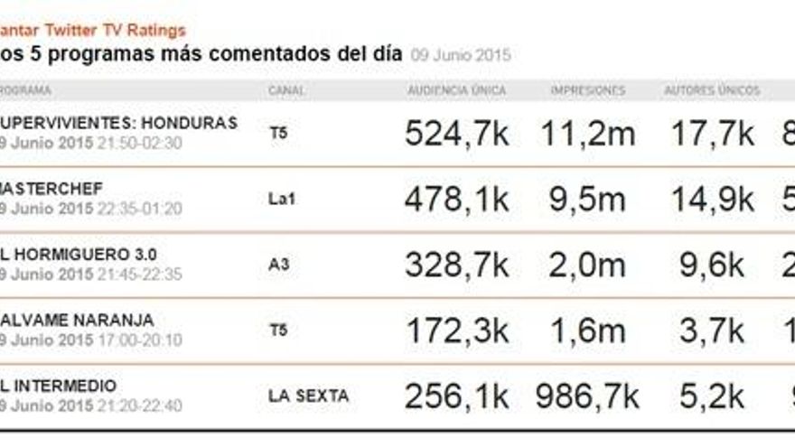 El concurso aventurero se coronó como el líder social del 9 de junio, en su cambio de día por una semana, superando con holgura a 'MasterChef' (55.000 tweets), y con la ausencia temporal de 'El Príncipe'.