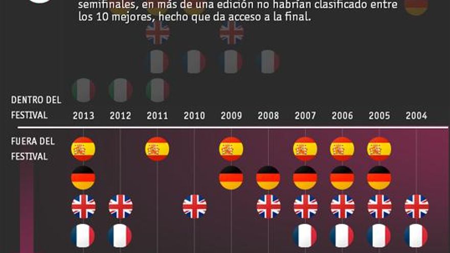 O también podemos realizar hipótesis como esta: en caso de que los países del Big Five hubieran tenido que pasar por semifinales, ¿hubieran sido eliminados? Si nos fijamos en las cinco últimas ediciones, tan solo las candidaturas de Pastora Soler (2013) y Daniel Diges (2010) hubieran pasado el corte.