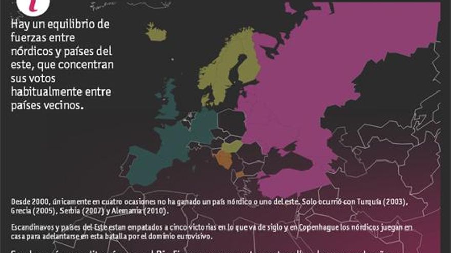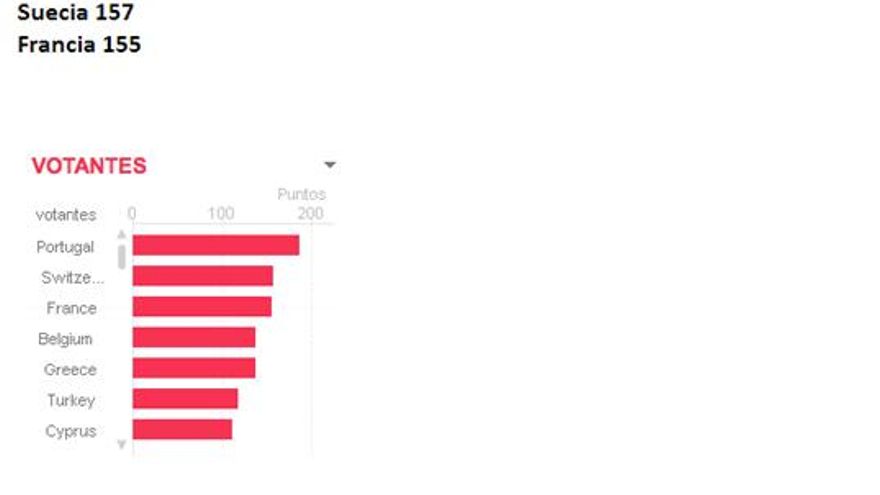 Así podemos descubrir qué países han votado históricamente más a los representantes españoles, así como los estados a los que más votos hemos dado nosotros. En el primero de los casos, encontraremos a Portugal (han otorgado 187 puntos a los cantantes españoles), Suecia (157) y Francia (155).