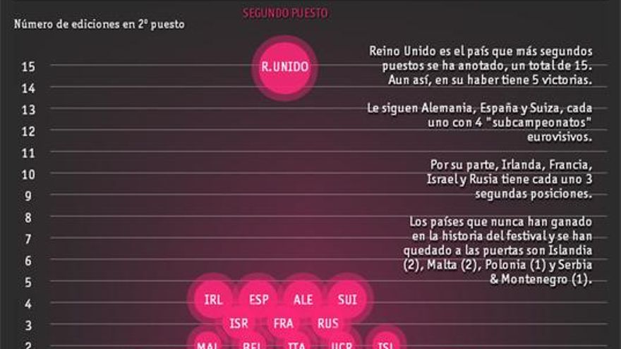 Para que los espectadores cuenten con toda la información necesaria para hacer sus propias cábalas y apuestas, RTVE ha abierto en su portal una plataforma desde la que poder conocer toda clase de datos estadísticos sobre la historia del certamen. Por ejemplo: ¿cuál es el país más habituado a ser “segundón” en el festival?