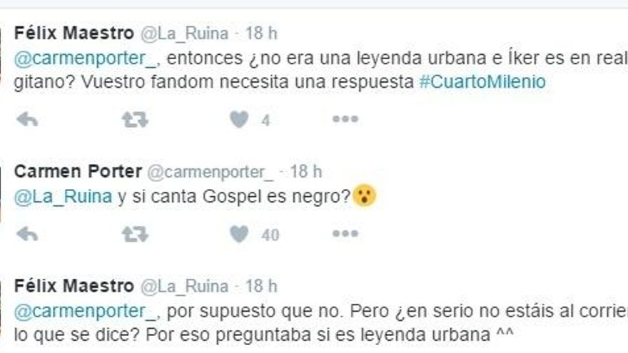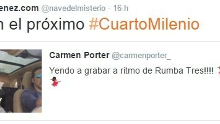 Carmen Porter publicaba un tuit en el que mostraba cómo se desplazban “a grabar” con Íker Jiménez “a ritmo de rumnba” y añadía un vídeo. En las imágenes vemos a ambos presentadores de 'Cuarto Milenio' dentro de su coche y cantando El tiburón del grupo Rumba tres: