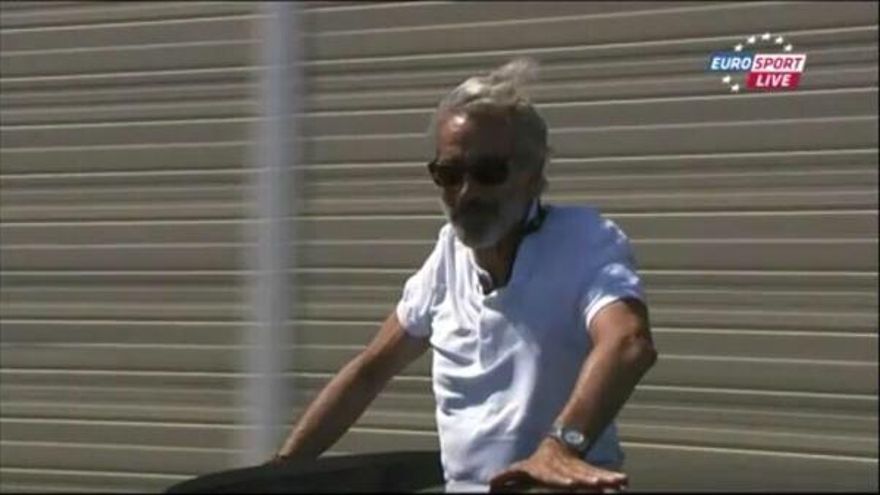 El actor leonés, que estrena próximamente la película 'Anacleto: Agente Secreto' a la espera del regreso de 'Cuéntame' a La 1, se ha asomado por la ventana superior del coche para disfrutar de sus privilegiadas vistas de la carrera que ha tenido salida en Estepona (Málaga).