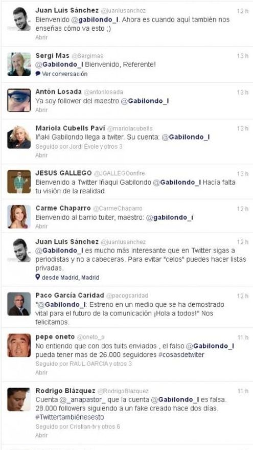 Pero antes de que Pastor corroborara, a través del propio Gabilondo, que la cuenta era un 'fake', muchos periodistas, entre los que había “televisivos” como Carme Chaparro (Informativos Telecinco) o Jesús Gallego (Te vas a enterar, Cuatro) habían dado veracidad a la cuenta, saludando al periodista en su nueva aventura: