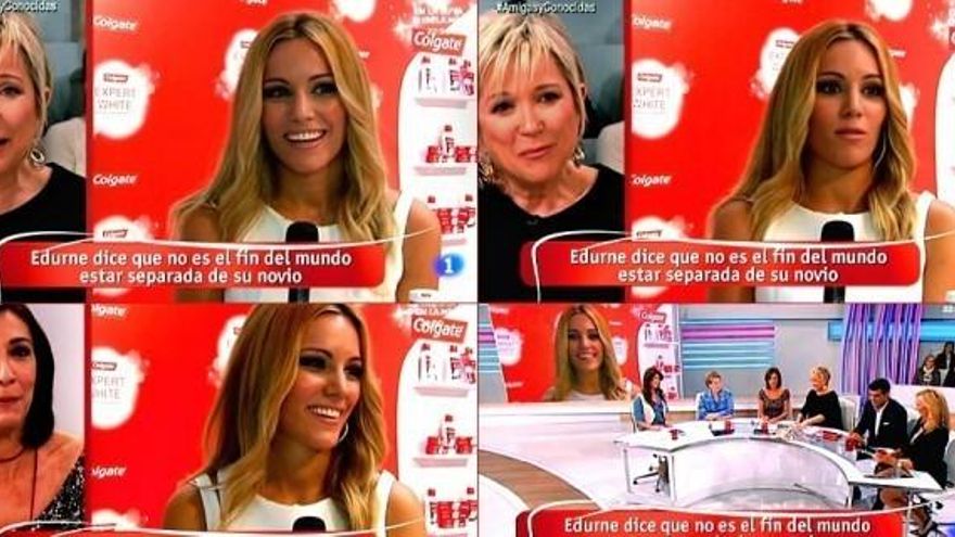 La representante española en Eurovisión 2015 se encontraba en un acto promocional de una marca de productos de limpieza dental. “Estoy aquí con una sonrisa”, saludaba a Ballester y a la mesa de colaboradoras, formada por Marta Robles, Paloma Gómez Borrero, Sonia Ferrer y Carmen Ro. “¿Y por qué estás tan contenta, Edurne?”, le preguntaba la presentadora del magacín, mientras la entrevistada procuraba dar notoriedad a la firma a la que representaba. “Estoy contenta porque estamos en la presentación de una nueva pasta dentífrica...”