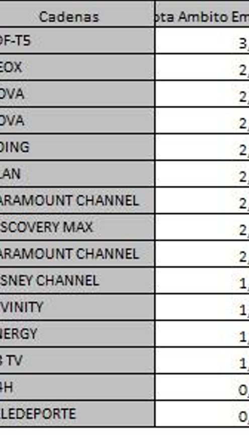 Ránking por cadenas del martes
