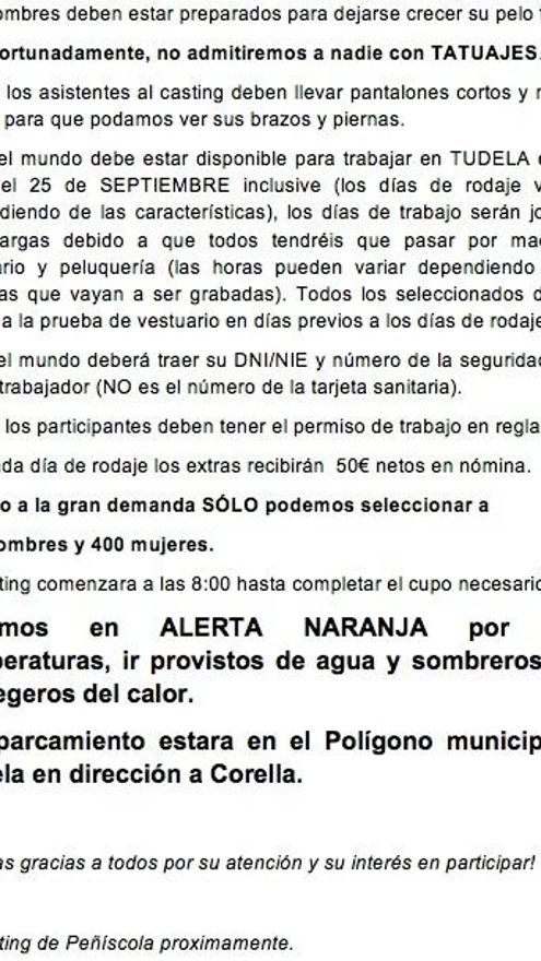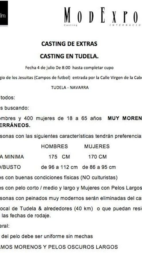 Según informa la agencia encargada, ModExpor, Tudela (Navarra) acogerá este 4 de julio acogerá una nueva acción para escoger a más extras españoles para el rodaje. El equipo busca a 1.200 figurantes (800 hombres y 400 mujeres) morenos y mediterráneos.Los seleccionados cobrarán 50 euros por cada día de trabajo.