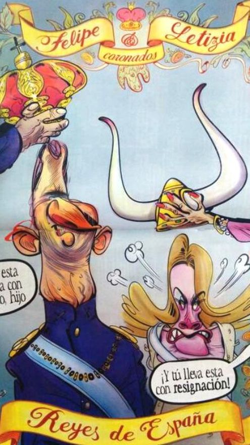 En la imagen interior, a doble página, Felipe y Letizia están siendo coronados por Juan Carlos y Sofía. Mientras el hasta ahora rey de España pone le dice a su hijo “Lleva esta corona con orgullo”, una supuesta (ex) Reina Sofía hace lo propia a Letizia pero con una corona con cornamenta y le comenta: “Lleva esta con resignación”, como recoge y muestraEcoteuve.