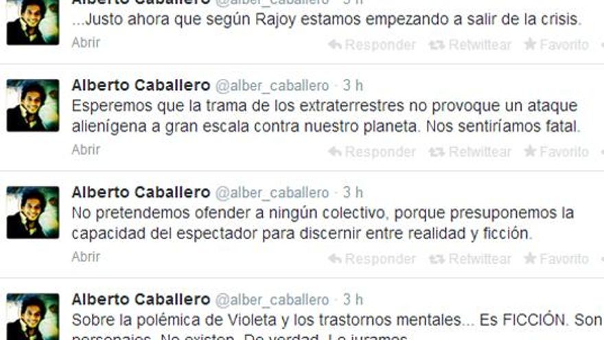 Alberto Caballero, en Twitter, ha querido defender su postura y la de la exitosa ficción de Telecinco: “Sobre la polémica de Violeta y los trastornos mentales... Es FICCIÓN. Son personajes. No existen. De verdad. Lo juramos.”. “No pretendemos ofender a ningún colectivo, porque presuponemos la capacidad del espectador para discernir entre realidad y ficción”.
