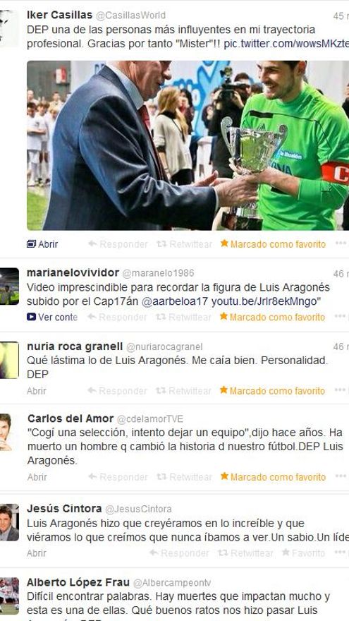 La muerte de Luis Aragonés ha teñido de luto la jornada del sábado. No solo en el mundo del fútbol, sino para la comunicación y los aficionados al deporte en general. El sabio de Hortaleza ha dejado una huella progunda en la memoria de jugadores, periodistas deportivos y aficionados, gracias a sus éxitos al frente del Atlético de Madrid y el triunfo de la Eurocopa de 2008, que marcó el inicio del periodo de mayor esplendor de la selección española.