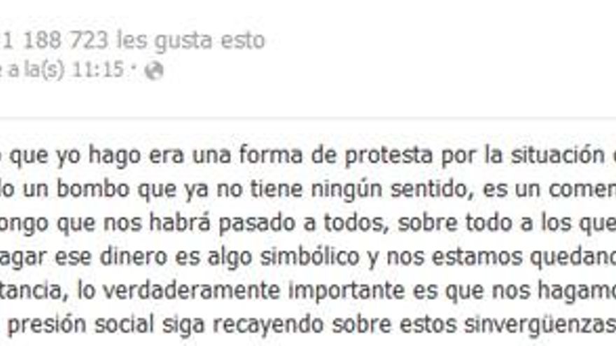 “Por favor, el comentario que yo hago era una forma de protesta por la situación que atraviesan esos padres, se le está dando un bombo que ya no tiene ningún sentido. Es un comentario en un momento de indignación que supongo que nos habrá pasado a todos, sobre todo a los que somos padres. El hecho de ofrecerse a pagar ese dinero es algo simbólico y nos estamos quedando con ese detalle que no tiene ninguna importancia, lo verdaderamente importante es que nos hagamos eco del sufrimiento de esta familia y que la presión social siga recayendo sobre estos sinvergüenzas”.