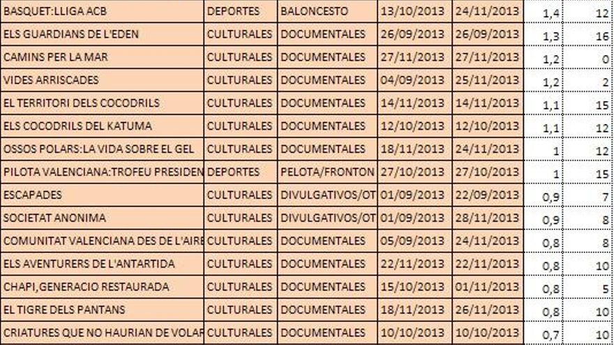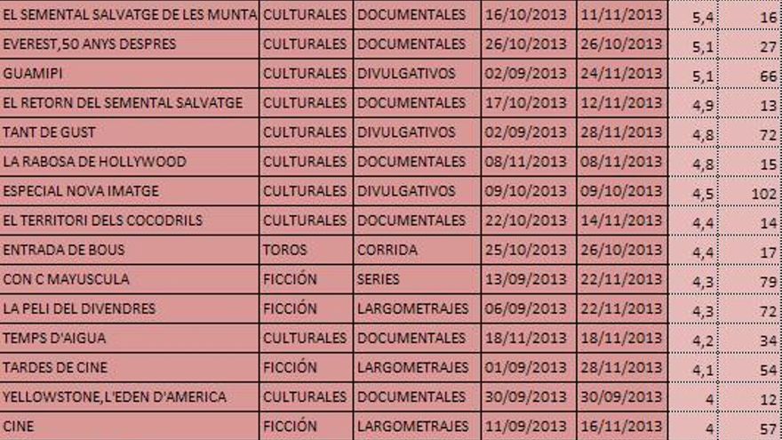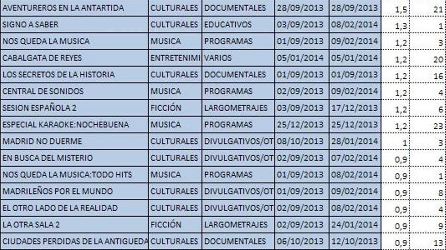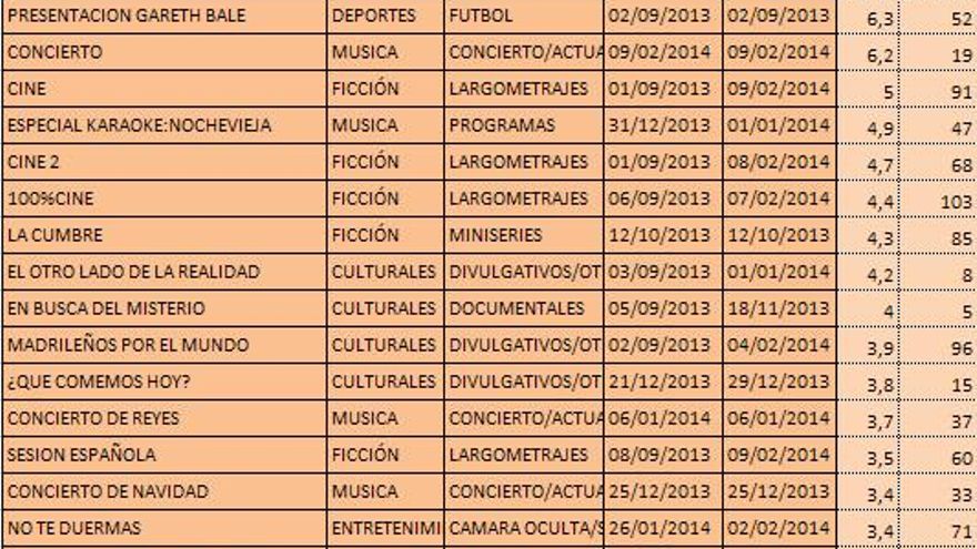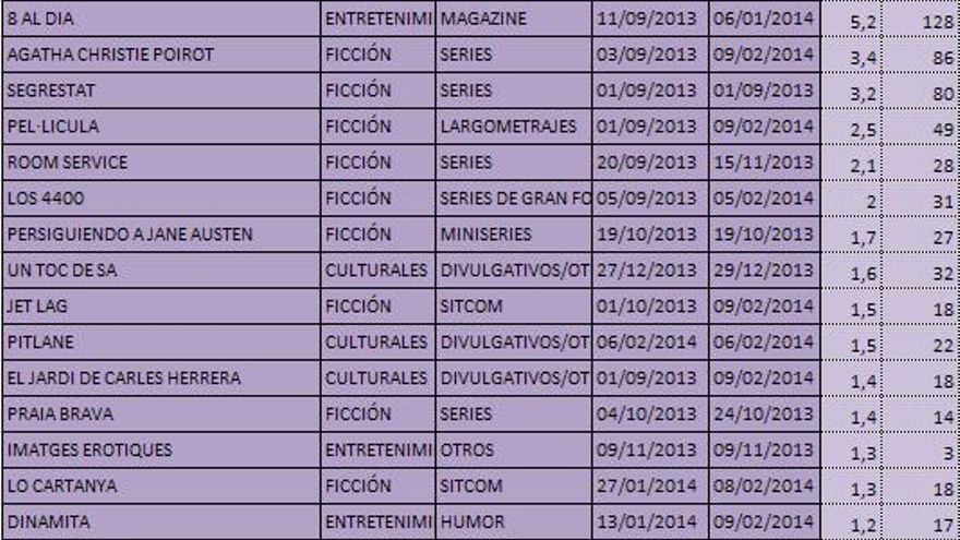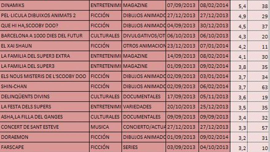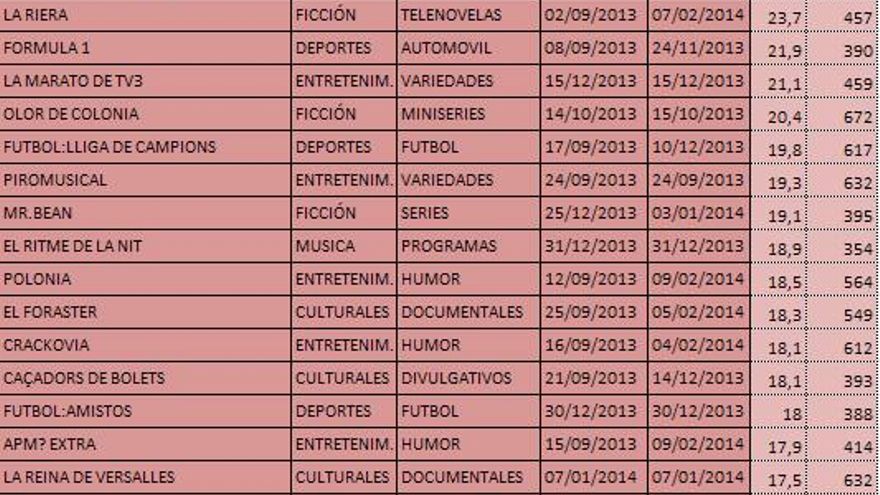 * Fuente: Kantar Media. Datos del 1 de septiembre de 2013 al 9 de febrero de 2014. Son los 20 programas que duren más de 25 minutos, excluyendo el género información y las repeticiones. La cuota está calculada en base a su territorio de emisión.