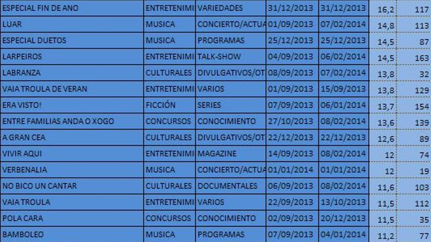 Otros programas que sobresalen son 'Larpeiros' (14.5%) y 'Labranza' (13.8%). El primero es un programa de cocina, aderezado con píldoras de humor, mientras que Labranza dedica atención al campo gallego. Ambos se emiten en horarios de prime time y en distintas horas en multidifusión.