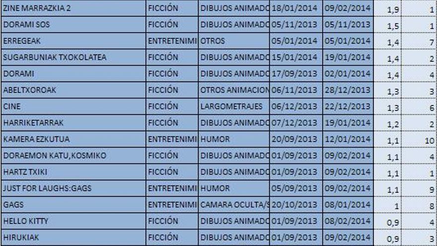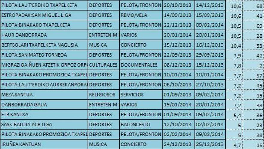 Los otros buenos datos de ETB, tanto en la cadena en castellano como en la que se emite en euskera, se reparten entre los programas de cine o los deportes autóctonos como remo, vela, fútbol o pelota que llegan a los dos dígitos en ETB1, que tiene una cuota media de 2.5%.