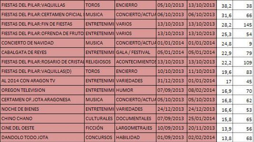 El éxito de la cadena aragonesa se basa también en la proximidad puesto que bate récords de audiencia, cada año, en las fiestas del Pilar, donde sus audiencias llegan a superar el 40% con la emisión de la ofrenda de flores, el pregón, las vaquillas, el certamen de jota y la ofrenda de frutos a la Virgen.