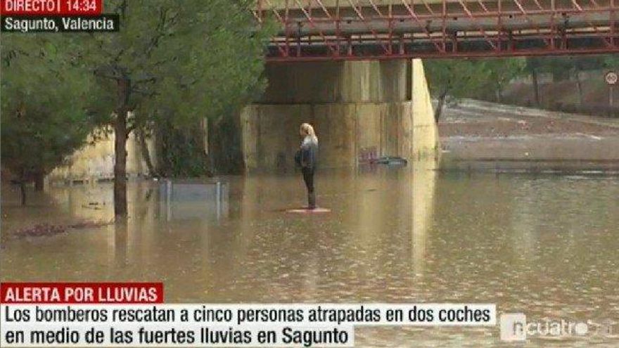 Las cámaras de Mediaset han grabado y emitido en directo cómo una vecina de Sagunto se quedaba atrapada con su coche en una carretera inundada. La pieza ha sido emitida en directo en Noticias Cuatro 14h, y ha mostrado cómo la mujer ha tenido que salir del vehículo por la ventanilla.