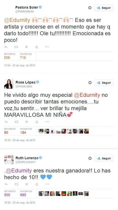 Este mensaje se fundió con muchos otros recibidos por Edurne a lo largo de la noche: desde su pareja, el futbolista David De Egea, a anteriores representantes en Eurovisión, como Ruth Lorenzo, Rosa López y Pastora Soler, o compañeros de profesión como David Bisbal.