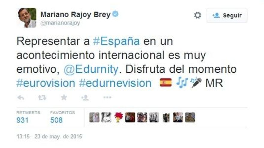 La participación de Edurne en el Festival de Eurovisión contó con espectadores de todo tipo. Además de los mensajes de apoyo de numerosos artistas, la cantante madrileña contó con los ánimos el presidente del gobierno, Mariano Rajoy.