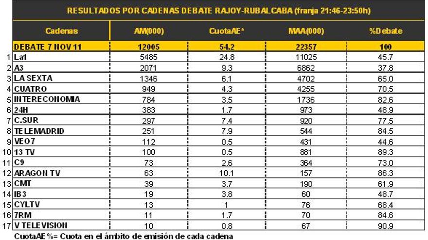 El debate Rubalcaba Vs. Rajoy que se celebró anoche reunió 12.006.000 espectadores y un 54.2% de cuota de pantalla, sumando los datos de todas las cadenas que lo ofrecieron: La 1, Antena3, Cuatro, laSexta, Intereconomía, 24 horas, Veo 7, 13TV, Canal Sur, Telemadrid, Canal 9, CMT, 7RM, Aragón TV, IB3 Baleares, Castilla y León Televisión y V Televisión.