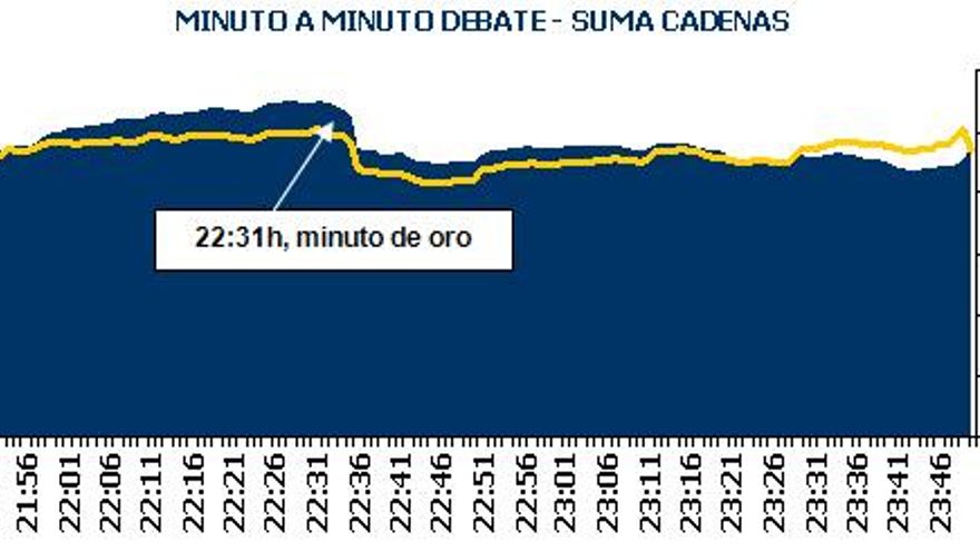 El minuto de oro se produjo a las 22:31 horas con 13.728.000 espectadores y 58.5% estaban viendo en algunas de las cadenas el debate político en el global de cadenas que emitieron el debate. En ese instante los candidatos hablaban sobre el subsidio por desempleo.