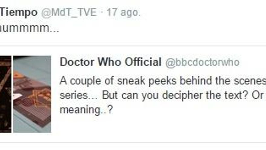 Desde la cuenta de Twitter de 'El Ministerio del Tiempo' publicaba esta semana un comentario, insinuando que 'Doctor Who' se ha inspirado en ellos. La imagen utilizada por la serie británica para promocionar sus nuevos capítulos tiene pequeñas coincidencias con el emblema de la ficción española.