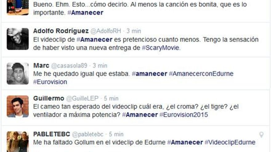 Rodado en Valencia a finales del mes de enero, el videoclip de ‘Amanecer’ cuenta con efectos especiales para crear ese mundo de fantasía e incluye un guiño a Eurovisión: el anillo de pedida de la protagonista del videoclip lleva grabada la fecha del Festival de Eurovisión, el 23-05-2015. Una fecha crucial en la carrera de Edurne, que luce en el video cuatro cambios de vestuario, según informa TVE en una nota.