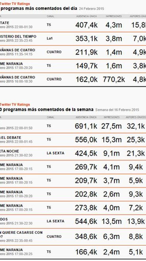 Por otra parte, los talent shows, realities o programas en directo -en este caso, 'Levántate'-, suelen partir con ventaja frente a las series a la hora de generar trending topics, lo que también habría contribuido a la dificultad de la ficción de Antena 3 para entrar en el Top 10 de volumen global, pese a ser el cuarto espacio televisivo más comentado de la noche. Asimismo, también los estrenos (como fue el caso ayer de 'El ministerio del tiempo') suelen generar más 'ruido' que una serie ya empezada.
