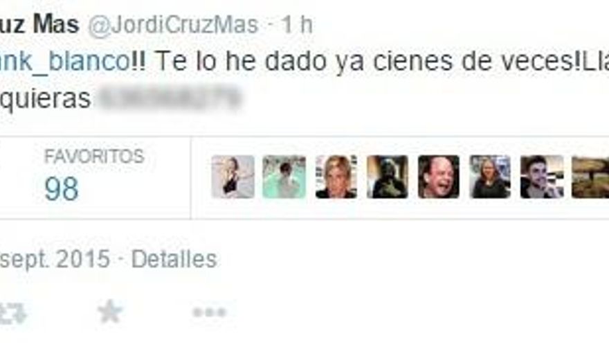 Hace unos días, Jordi Cruz publicaba en su cuenta personal de Twitter su número de teléfono, tras ser preguntando por Frank Blanco.