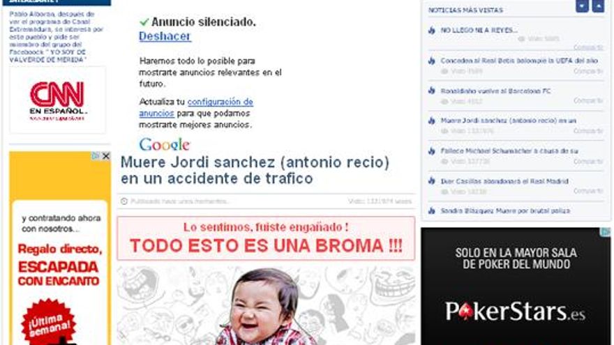 El portal, basado en la publicación de noticias falsas por parte de sus usuarios, afirmaba que Jordi Sánchez “había fallecido en un accidente de tráfico”. Noticia que corrió como la pólvora en la red aupando al actor como uno de los rostros tendencia en las redes sociales.