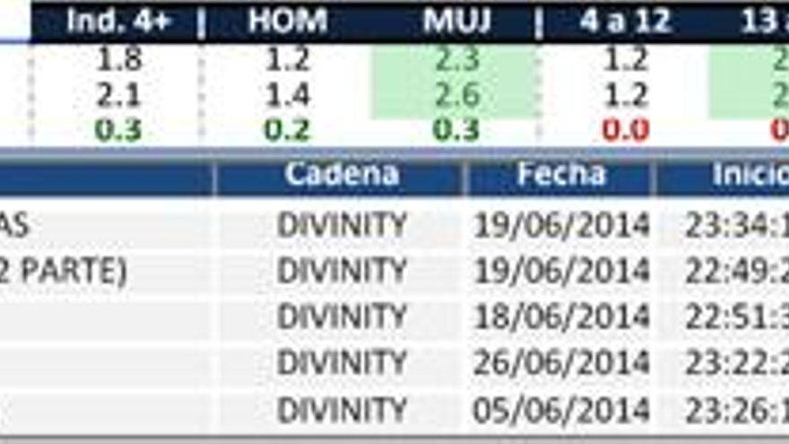 Divinity (2,1%) sube tres décimas y logra máximo mensual, con sus mejores cuotas en madrugada, y “late-night”. Sus principales fortalezas se encuentran en las mujeres y en los individuos de 13 a 64 años. El ránking de emisiones está encabezado por “El Cuerpo del delito”.