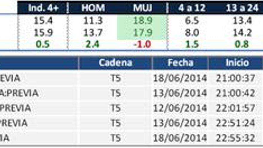 No obstante, Telecinco sube menos de lo esperado, debido a la ausencia anticipada de España en el Mundial. De hecho, lo hace con un punto menos del que obtuvo en junio de 2012 con la Eurocopa (16.7%).