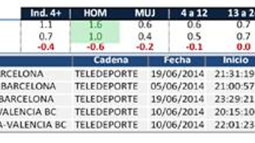 Teledeporte (0,7%) baja cuatro décimas en junio. La cadena presenta un perfil de audiencia marcadamente masculino y regular en cuanto a edades. Su mejor franja es la madrugada. La emisión más vista de la cadena es la final de baloncesto Liga ACB “R. Madrid-Barcelona”.