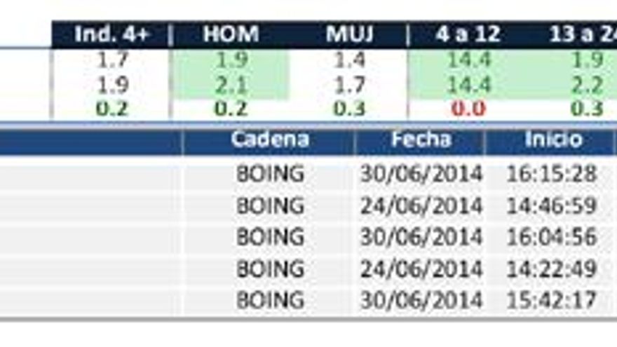 Boing (1,9%) sube dos décimas con respecto al mes de mayo. Es la segunda opción más vista entre los niños de 4 a 12 años con el 14,4% de cuota y tiene un perfil masculino. La mañana y la sobremesa son sus mejores horarios. La emisión más vista corresponde a “Just Kidding”.