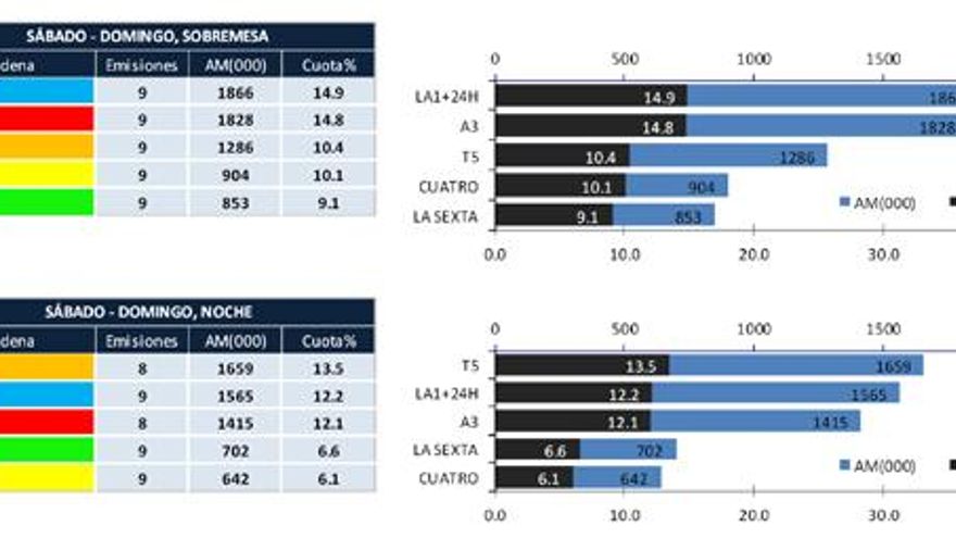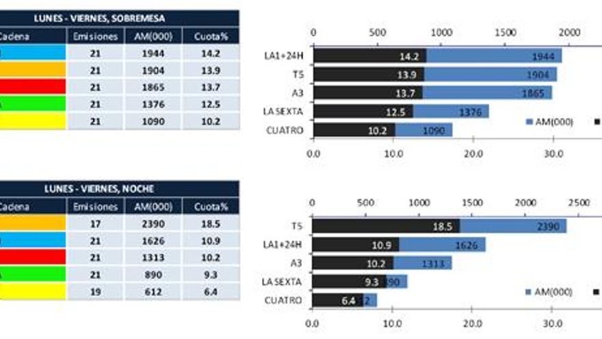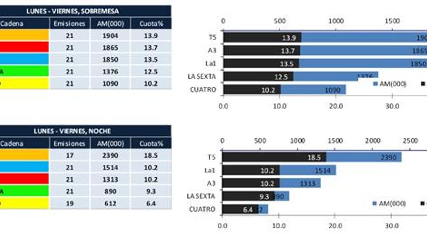 - Telecinco repite liderazgo en la edición de sobremesa y noche de lunes a viernes; y en la noche de los fines de semana.