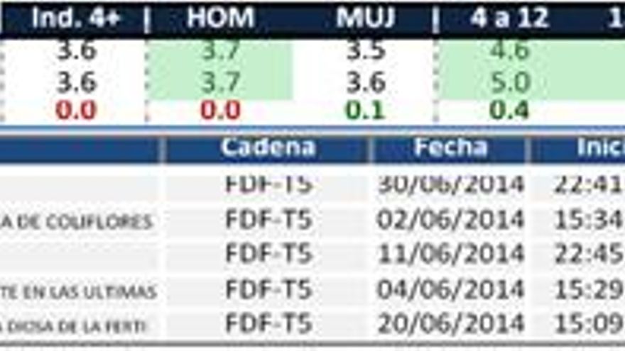 FDF-T5 (3,6%) repite el resultado de mayo cuando logró su máximo mensual. Sus mejores cuotas son hombres, y espectadores menores de 44 años, especialmente en jóvenes de 13 a 24 años. Por franjas, destaca madrugada y “late-night”. Lo más visto es la película “Intocable”.