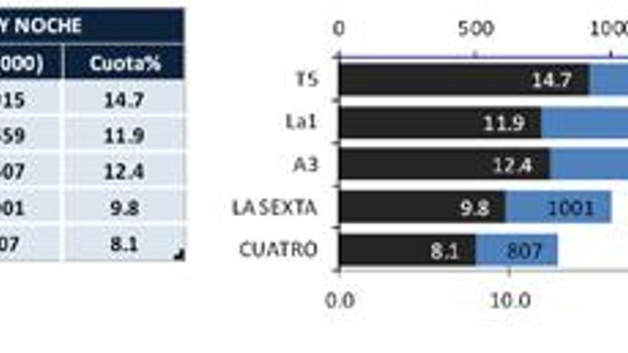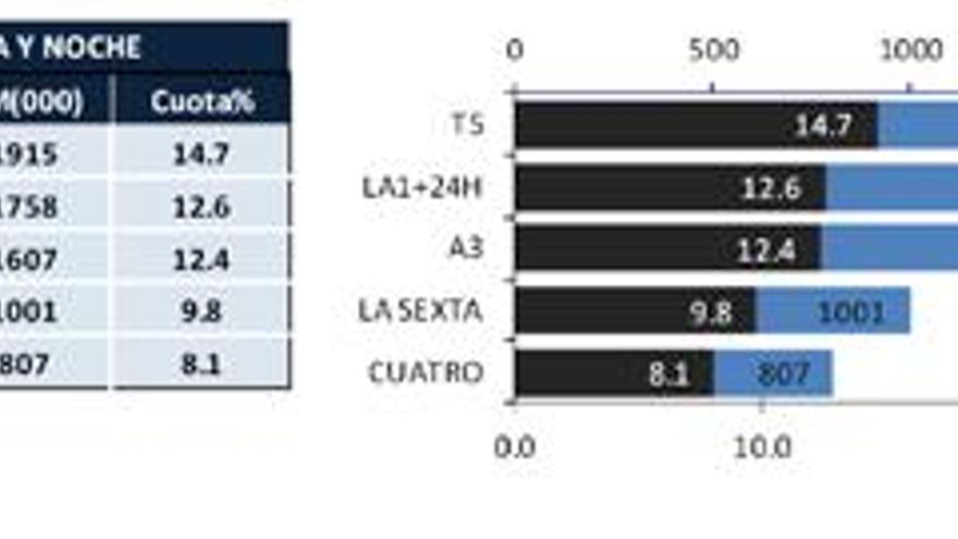 - laSexta aventaja a Cuatro en 194,000 espectadores.