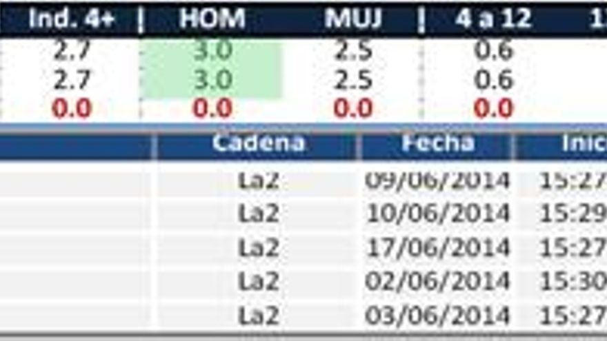 La2 (2,7%) repite el resultado del mayo. El perfil de su audiencia es masculino y fideliza a los mayores de 45 años. Sus resultados más destacados los logra en la franja de sobremesa. El programa más visto de la cadena es, como siempre, “Saber y Ganar”.