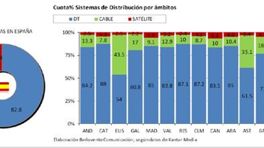 El consumo a través de TDT (82,8%) baja tres décimas, el Satélite (3,8%) baja cuatro y el Cable (13,3%) sube tres. Cataluña es la región que más consume a través de TDT. País Vasco y Asturias las que más lo hacen utilizando el Cable, y Canarias el Satélite.