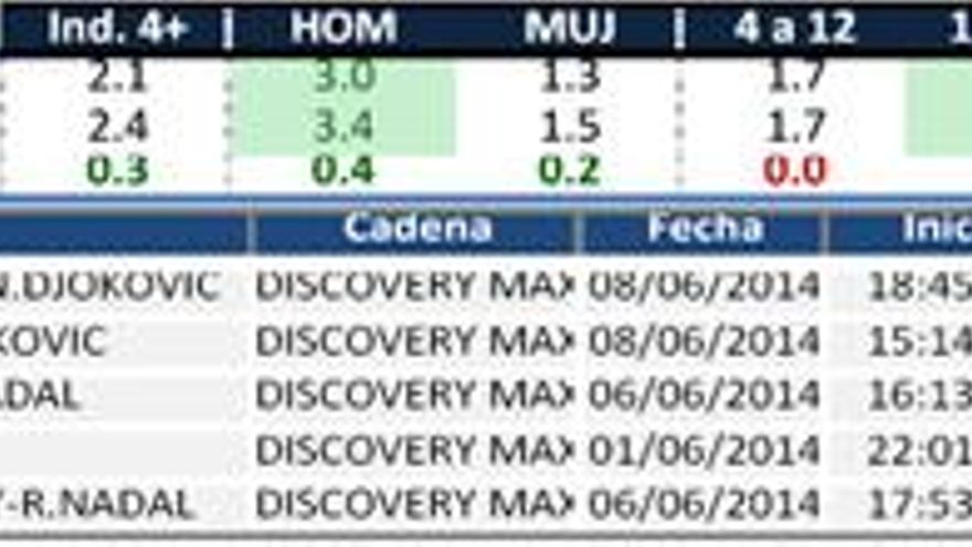Discovery Max (2,4%) sube tres décimas y vuelve a batir su máximo mensual en junio. Tiene un perfil marcadamente masculino y con plusvalías en el grupo de 13 a 44 años. La madrugada y la mañana son sus mejores franjas. La emisión más vista corresponde al tenis Roland Garros: Nadal-DJokovic.
