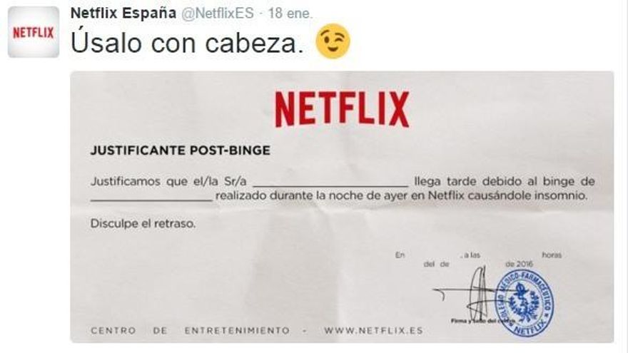 “Justificante post-binge” se llama el documento y está firmado y sellado por su propio colegio médico farmacéutico, de forma siempre humorística. Se trata de un guiño más que le hace el gigante Netflix a sus seguidores desde las redes sociales.