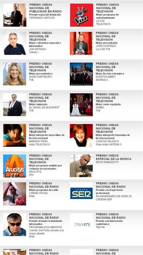 'La Voz', 'Isabel', Mariano Peña, Concha Velasco, Jon Sistiaga, Jordi Hurtado, Anne Igartiburu, 'Downton Abbey', 'El ángel de Budapest', y 'Arucitys' fueron los triunfadores de la 59ª edición de los Premios Ondas, que se entregaron ayer en Barcelona.