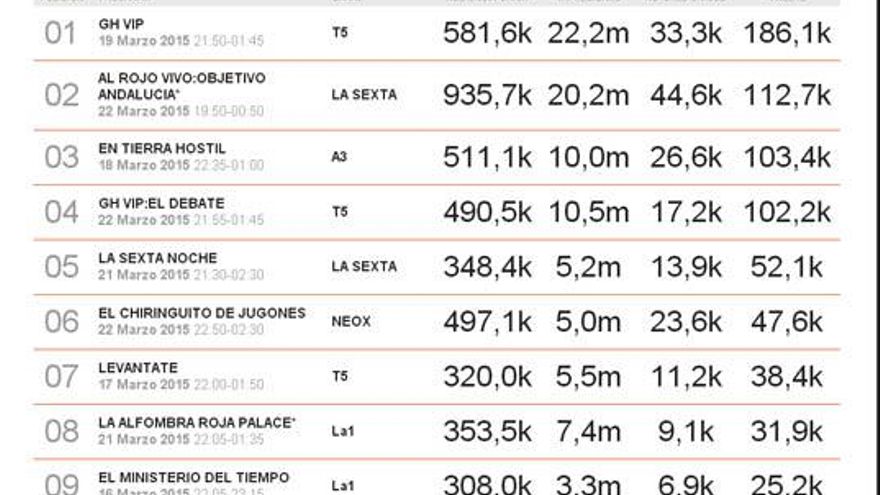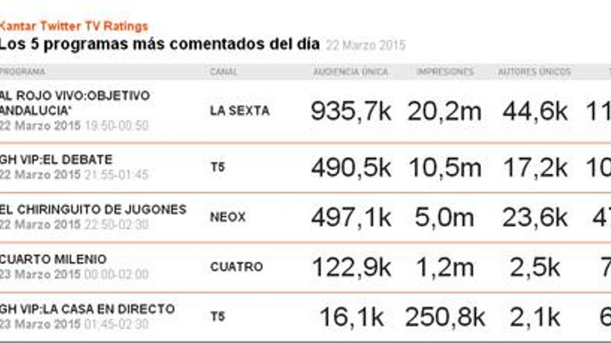 Las elecciones andaluzas y el triunfo socialista incendiaron las redes sociales, dándole al programa de laSexta 'Al rojo vivo: Objetivo Andalucía' 112.000 tuits y 20 millones de impresiones, colándose así en el primer puesto de la lista. Por el contrario, 'GH VIP: El debate' baja por primera vez al segundo puesto en la audiencia social aunque con el doble de comentarios respecto a la semana pasada, 102.000 tuis de 17.000 usuarios únicos.