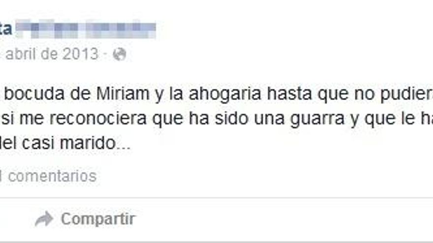 Otra cosa que queda clara, buceando en la red en busca de más información, es su afición por el reality show del que ahora va a ser concursante. A través de su cuenta de Facebook, se mostraba especialmente exaltada comentando la edición de 2013: “Cogería a la bocuda de Miriam y la ahogaría hasta que no pudiera respirar, solo pararía si me reconociera que ha sido una guarra y que le ha tomado el pelo al friki del casi marido...”.