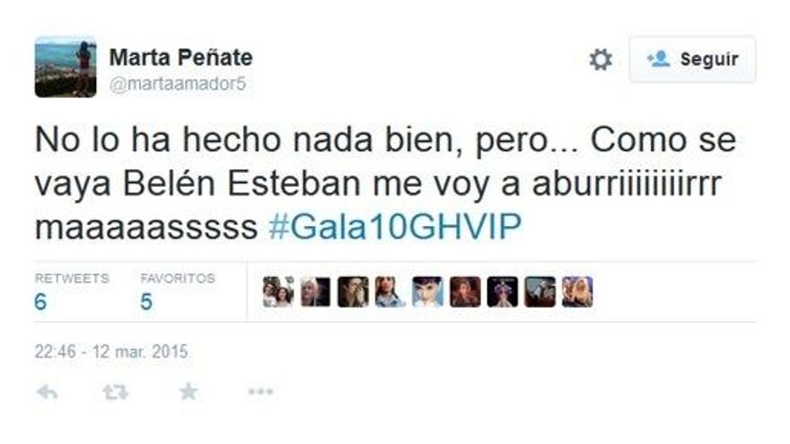 También la pudimos leer comentando 'Gran Hermano VIP' a través de su cuenta de Twitter. “No lo ha hecho nada bien, pero... Como se vaya Belén Esteban me voy a aburrir”, escribía en su perfil, que no ha tardado en ser borrado.